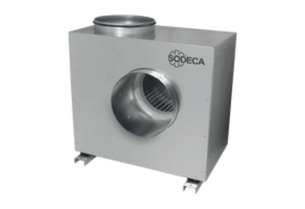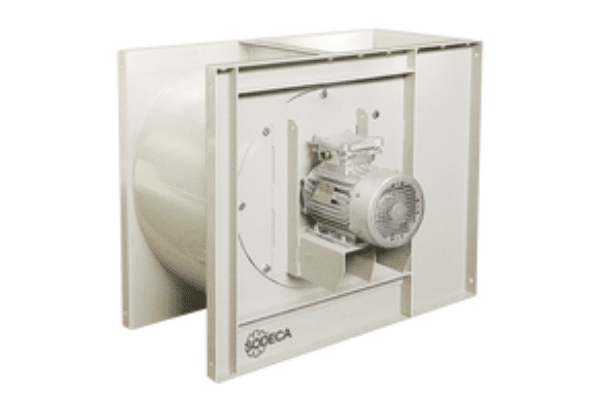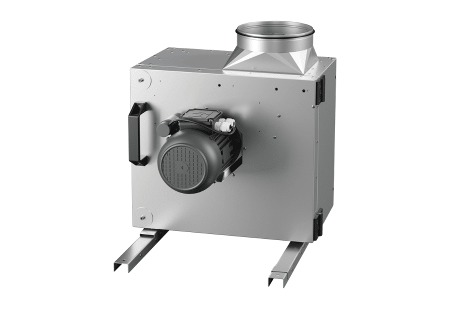 Radialfläkt för utsug av brandgaser +400°C/120min med Swing-Outlucka för enkel inspektion och service. Låg ljudnivåmed 40mm isolerat hölje.