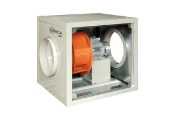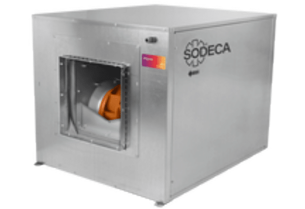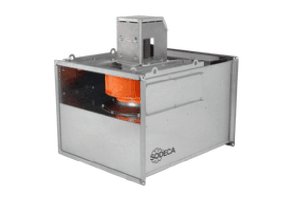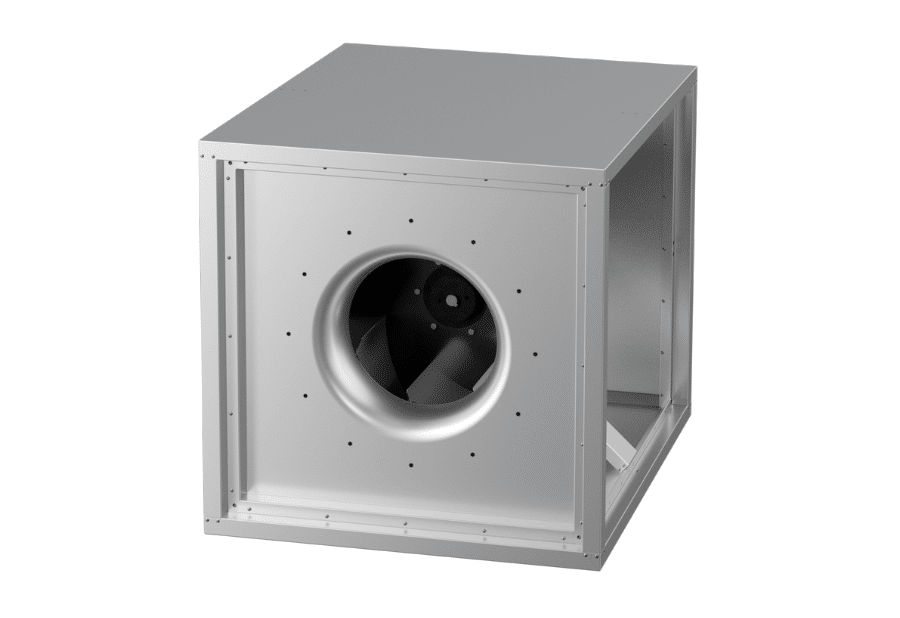 400V, IP55, Fläkt med bakåtböjda skovlar inbyggd i värme- & ljudisolerad box. Linjär luftriktning med kvadratisk/rektangulär anslutning för montage inom eller utanför brandcell.Kanalanslutning från ca: 400-1000 m