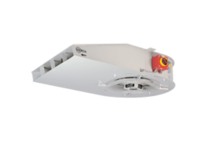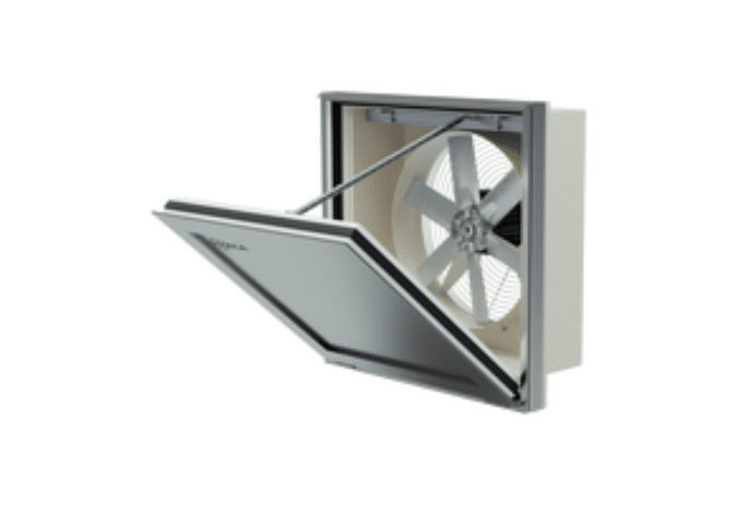 Dynamiskt väggmonterad utsugsfläkt THT-WALL. Motorstyrd öppningslucka. Ansluts mot kanal för utsug. Luftflöde från 6000m³/h och upp till 76.000m³/h.