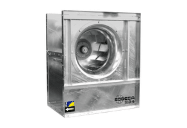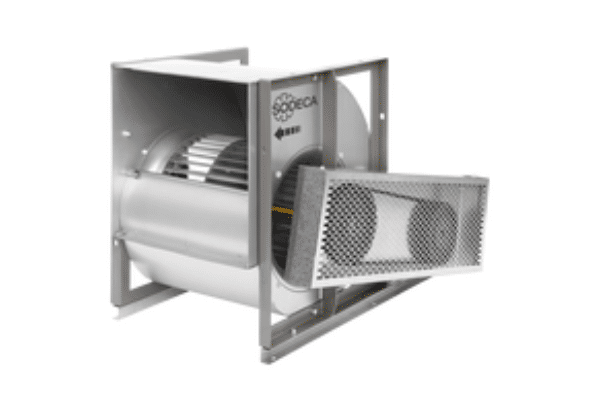 Komplett remdriven dubbelsugande radialfläkt med bakåtböjda skovlar. Inbyggd i isolerad box.