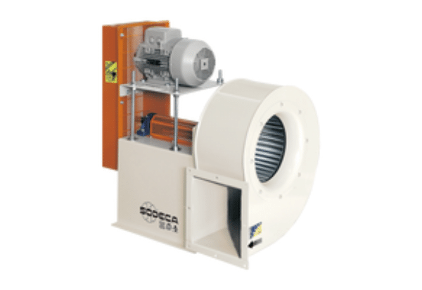 Remdriven radialfläkt för utsug av ren eller lätt dammig luft, anpassad för industriellt bruk. Komplett med motor och väl inkapslad remdrift. FläkthjulBhjul med delvis självrensande skovlar.
