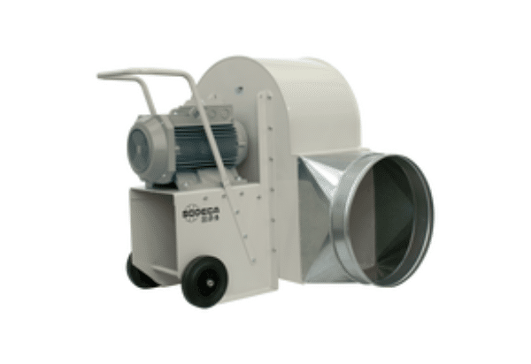 Portabel fläkt FAST -P för evakuering av förorenad/dammig luft ifrån tillverkningsprocess av papper/trä/läder/tyg och plastindustri. Direktdriven motor med motorskydds-brytare, 1f 230V. Skyddsklass IP54.