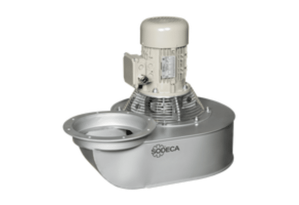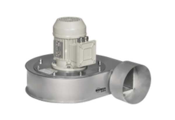 Radialfläkt för utsug ifrån bageriugnar och ytbehandling. Max +80°C och både fläkthölje och fläkthjul i rostfritt stål. Anslutning mot Ø160mm.